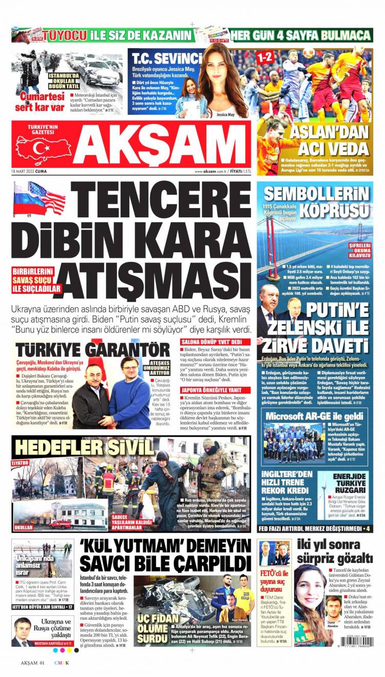 Günün Ulusal Gazete Manşetleri – 18 03 2022Ulusal Gazetelerin 1. sayfaları Haber Merkezi Yayınlanma: 18.03.2022 - 11:50 Son güncellenme: 28.01.2025 - 12:40 Akşam