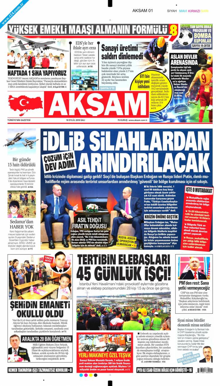 * Günün Ulusal Gazete Manşetleri – 18 09 2018Ulusal Gazetelerin 1. sayfaları Haber Merkezi Yayınlanma: 18.09.2018 - 11:50 Son güncellenme: 29.01.2025 - 07:12 Akşam