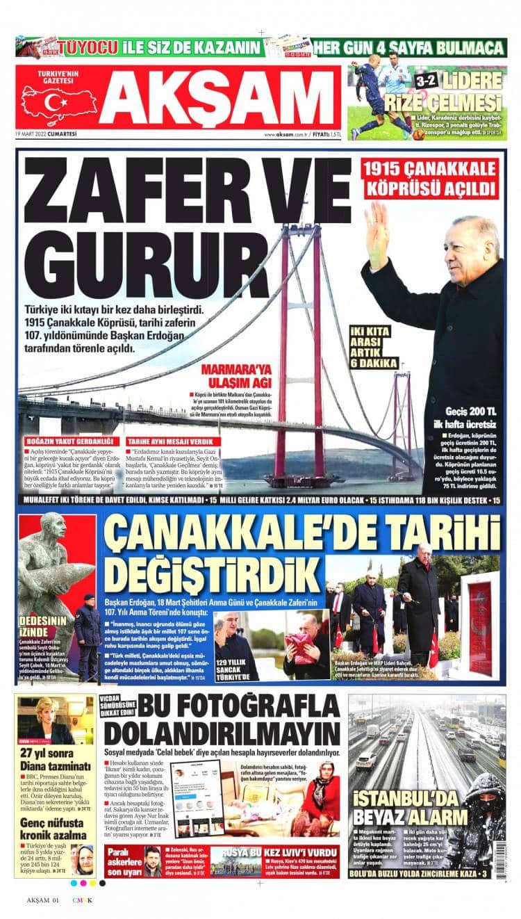 Günün Ulusal Gazete Manşetleri – 19 03 2022Ulusal Gazetelerin 1. sayfaları Haber Merkezi Yayınlanma: 19.03.2022 - 11:50 Son güncellenme: 28.01.2025 - 12:39 Akşam