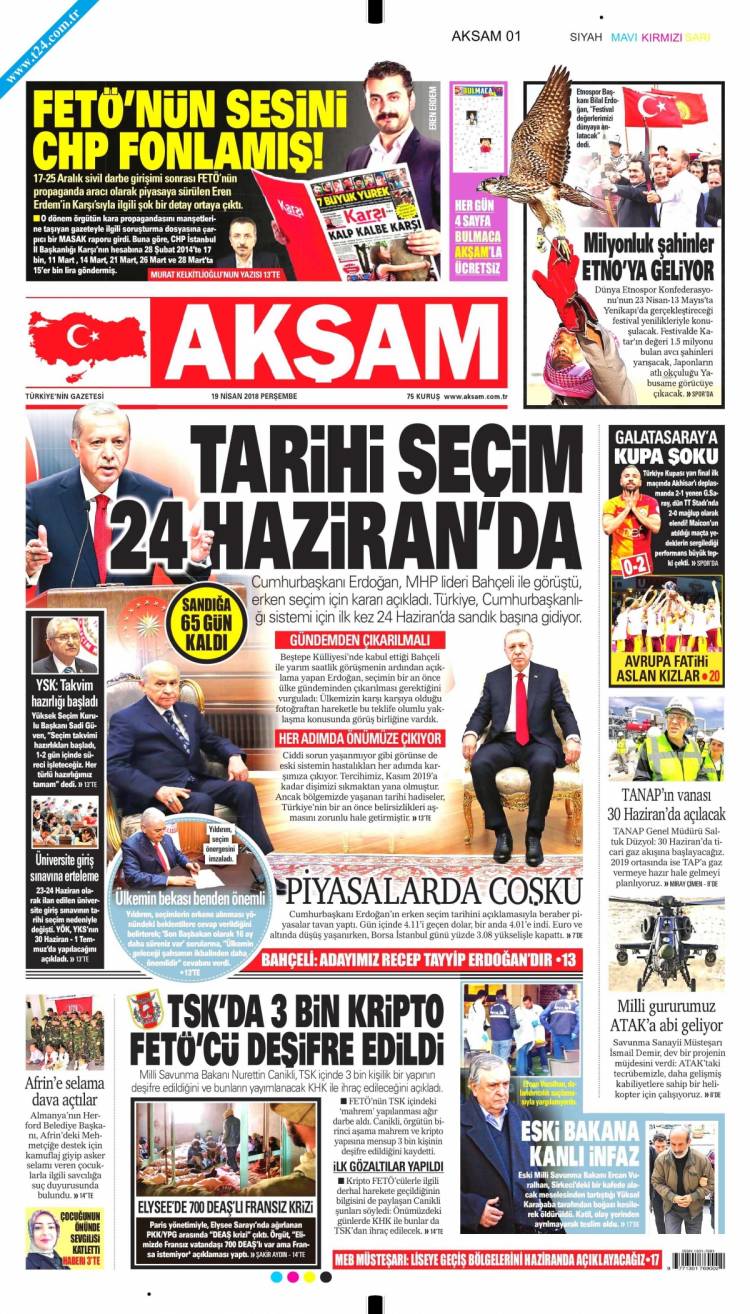 * Günün Ulusal Gazete Manşetleri – 19 04 2018Ulusal Gazetelerin 1. sayfaları Haber Merkezi Yayınlanma: 19.04.2018 - 11:50 Son güncellenme: 29.01.2025 - 10:20 Akşam