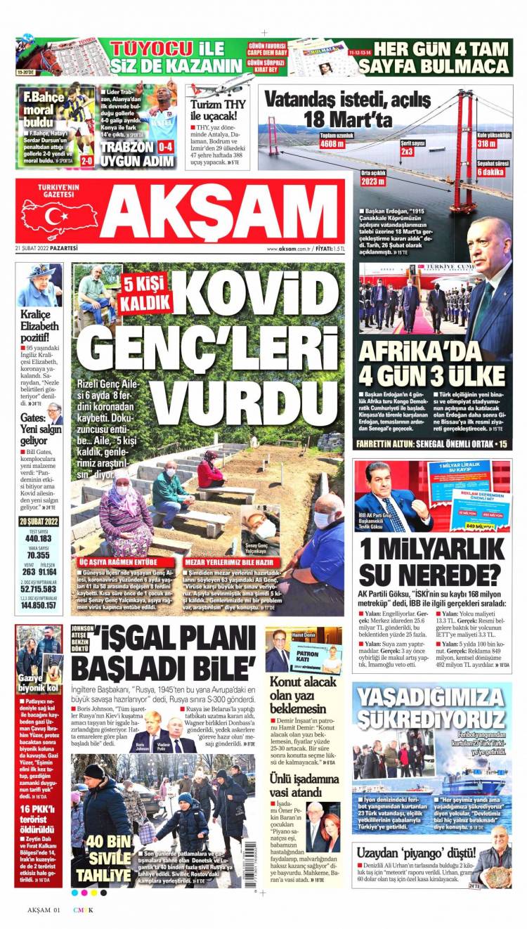 Günün Ulusal Gazete Manşetleri – 21 02 2022Ulusal Gazetelerin 1. sayfaları Haber Merkezi Yayınlanma: 21.02.2022 - 11:50 Son güncellenme: 28.01.2025 - 13:00 Akşam