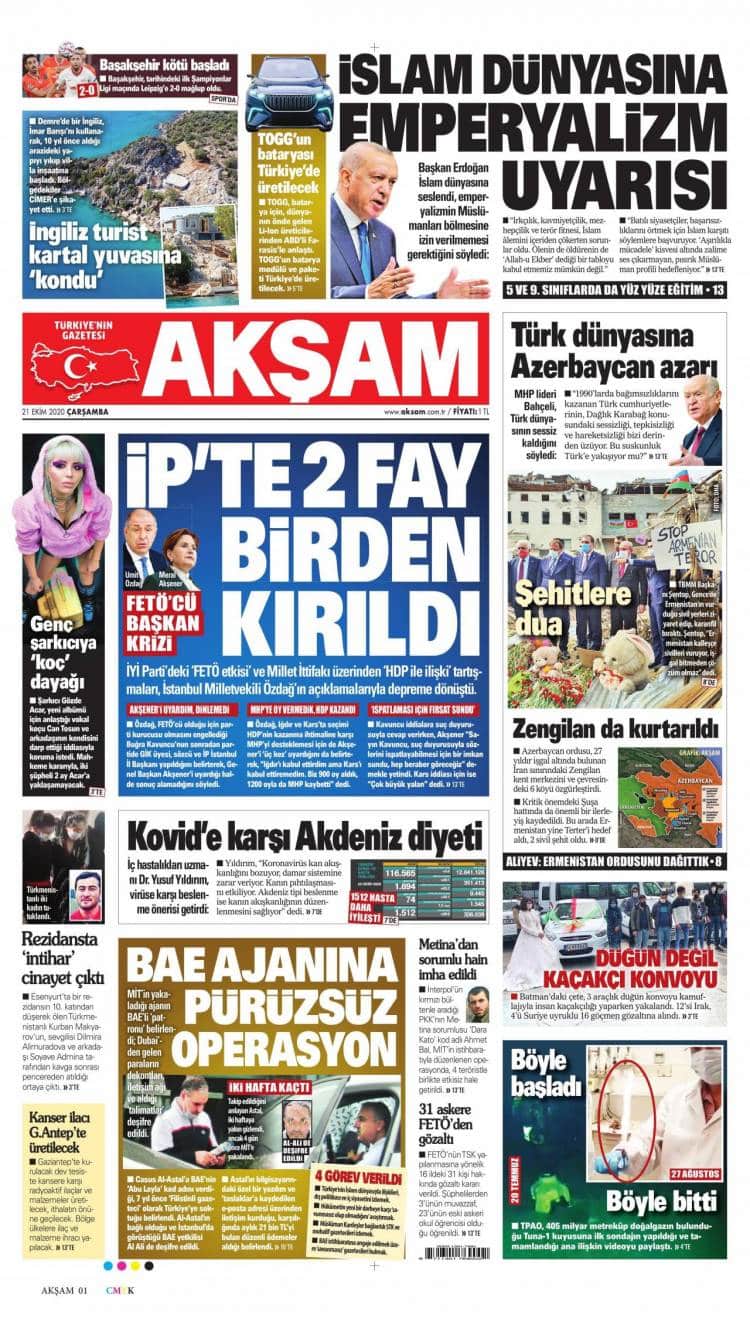 * Günün Ulusal Gazete Manşetleri – 21 10 2020Ulusal Gazetelerin 1. sayfaları Haber Merkezi Yayınlanma: 21.10.2020 - 11:50 Son güncellenme: 28.01.2025 - 19:53 Akşam