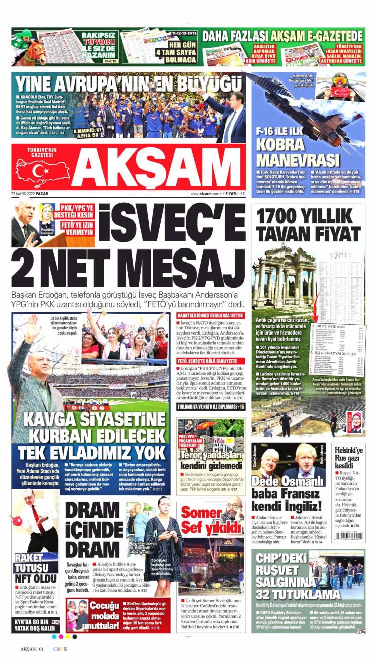* Günün Ulusal Gazete Manşetleri – 22 05 2022Ulusal Gazetelerin 1. sayfaları Haber Merkezi Yayınlanma: 22.05.2022 - 11:50 Son güncellenme: 28.01.2025 - 11:43 Akşam