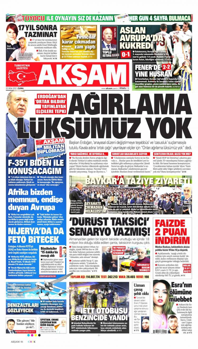 * Günün Ulusal Gazete Manşetleri – 22 10 2021Ulusal Gazetelerin 1. sayfaları Haber Merkezi Yayınlanma: 22.10.2021 - 11:50 Son güncellenme: 28.01.2025 - 14:44 Akşam