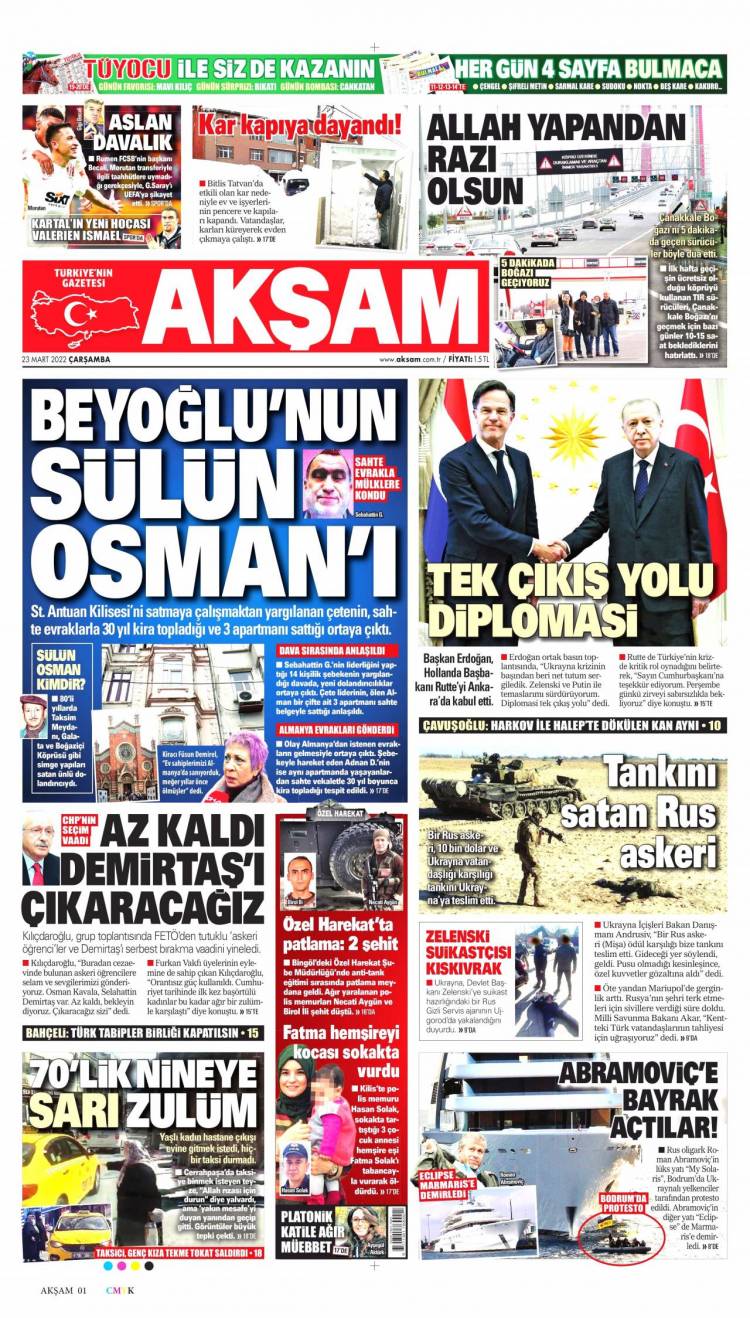 Günün Ulusal Gazete Manşetleri – 23 03 2022Ulusal Gazetelerin 1. sayfaları Haber Merkezi Yayınlanma: 23.03.2022 - 11:50 Son güncellenme: 28.01.2025 - 12:35 Akşam