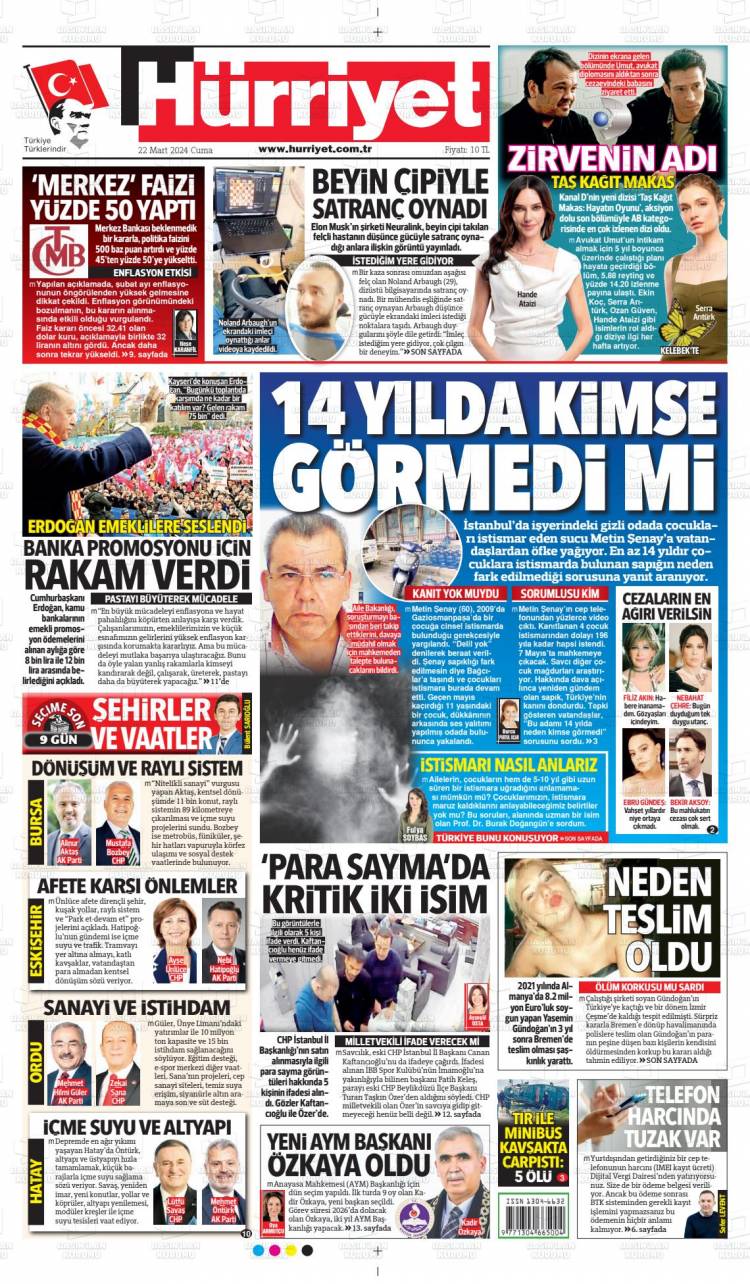 * Günün Ulusal Gazete Manşetleri – 23 03 2024Ulusal Gazetelerin 1. sayfaları Haber Merkezi Yayınlanma: 23.03.2024 - 11:50 Son güncellenme: 28.01.2025 - 02:30 Hürriyet