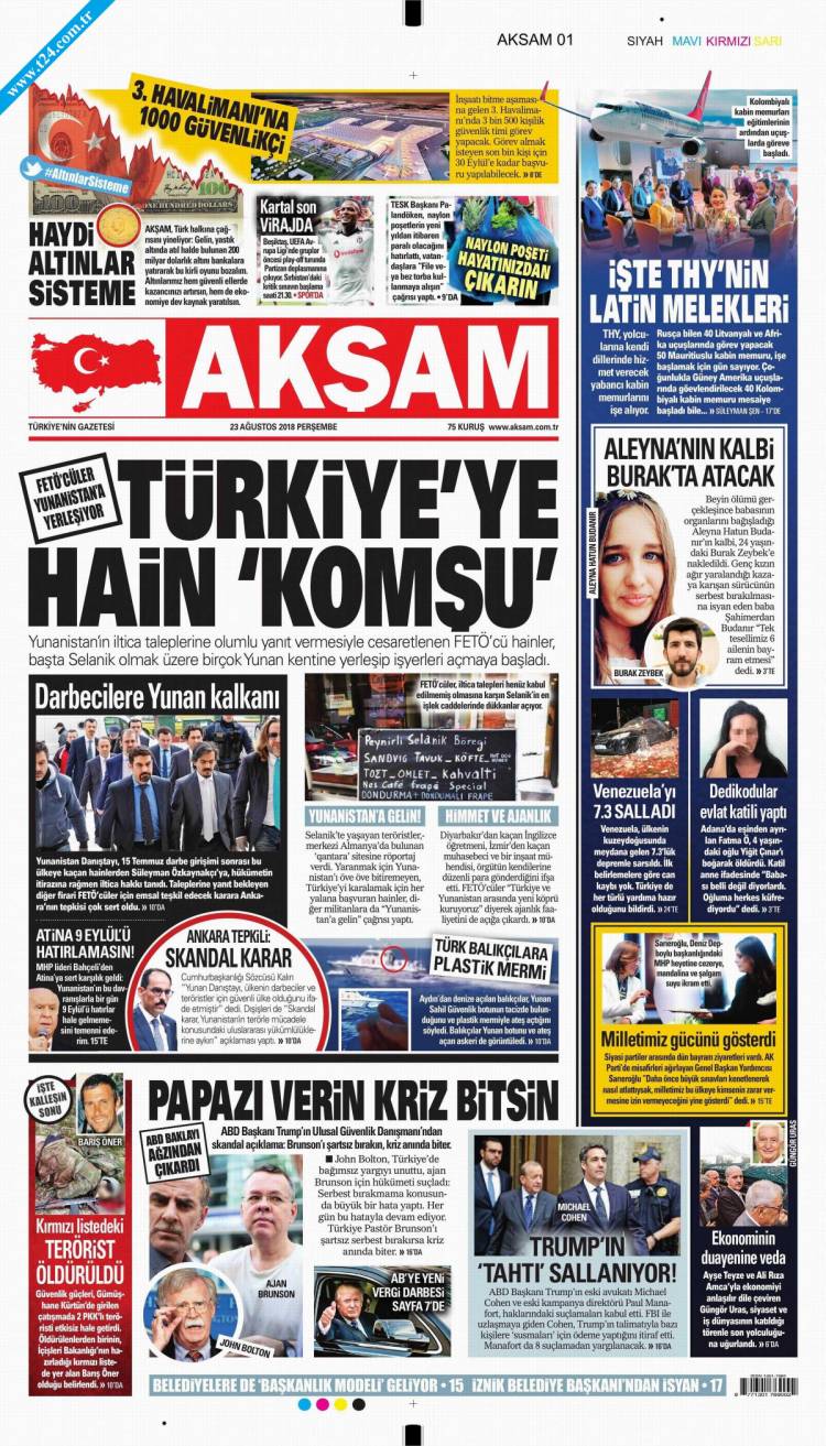 Günün Ulusal Gazete Manşetleri – 23 08 2018Ulusal Gazetelerin 1. sayfaları Haber Merkezi Yayınlanma: 23.08.2018 - 11:50 Son güncellenme: 29.01.2025 - 07:43 Akşam
