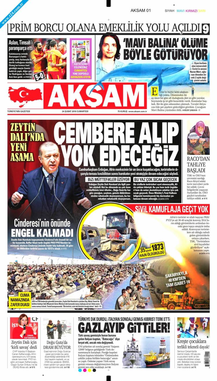 * Günün Ulusal Gazete Manşetleri – 24 02 2018Ulusal Gazetelerin 1. sayfaları Haber Merkezi Yayınlanma: 24.02.2018 - 11:50 Son güncellenme: 29.01.2025 - 11:47 Akşam