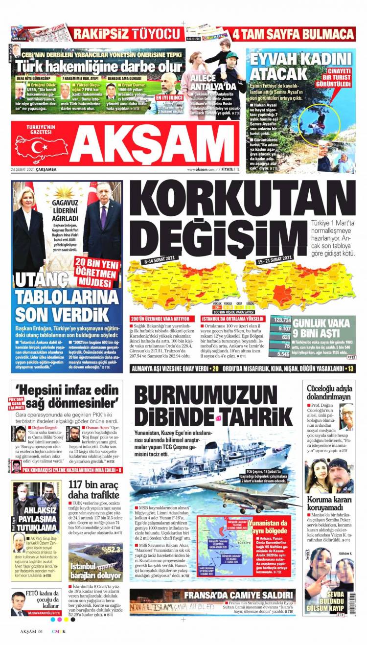 Günün Ulusal Gazete Manşetleri – 24 02 2021Ulusal Gazetelerin 1. sayfaları Haber Merkezi Yayınlanma: 24.02.2021 - 11:50 Son güncellenme: 28.01.2025 - 18:05 Akşam