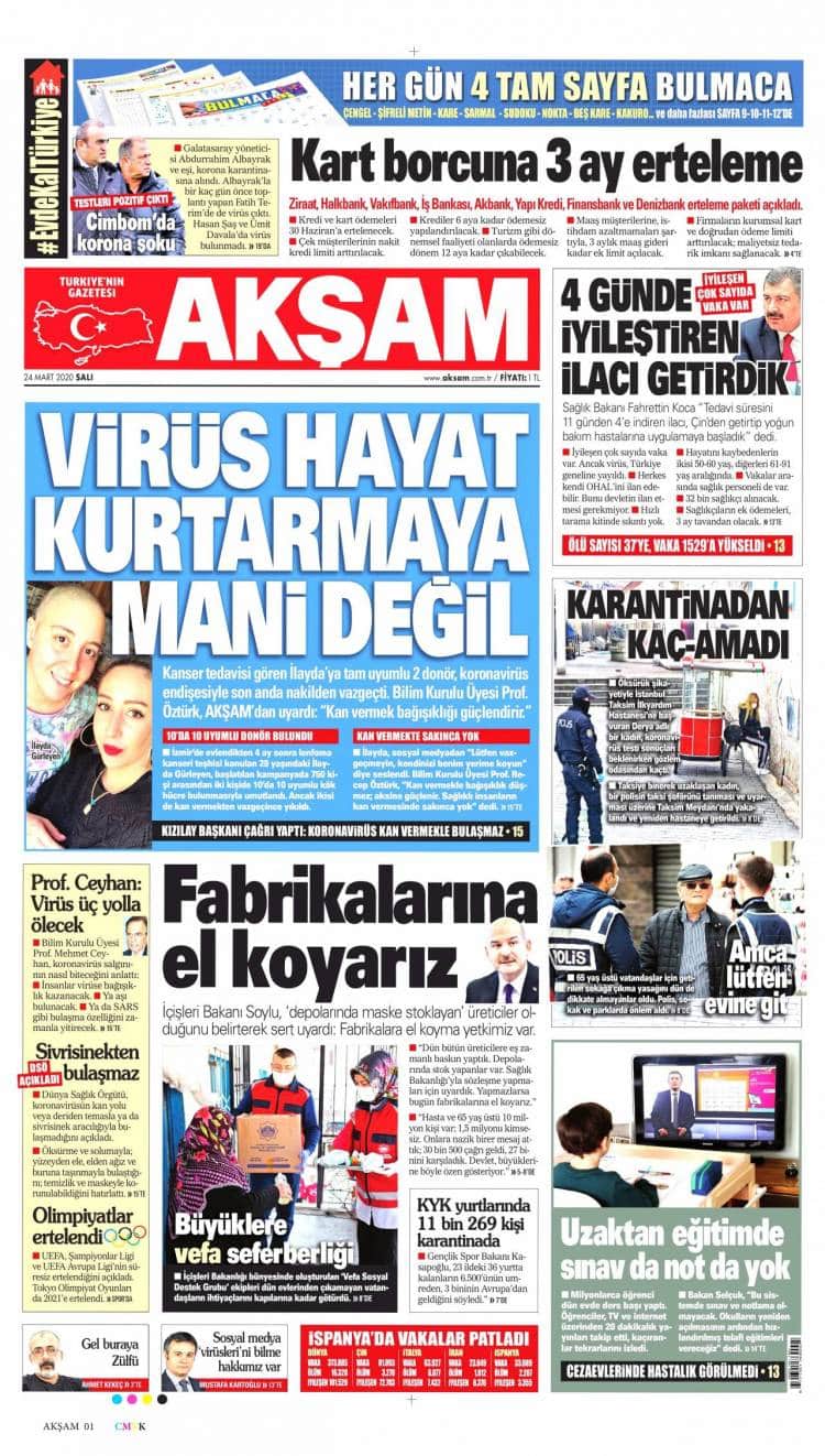 * Günün Ulusal Gazete Manşetleri – 24 03 2020Ulusal Gazetelerin 1. sayfaları Haber Merkezi Yayınlanma: 24.03.2020 - 11:50 Son güncellenme: 28.01.2025 - 23:05 Akşam