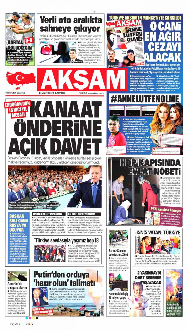 * Günün Ulusal Gazete Manşetleri – 24 08 2019Ulusal Gazetelerin 1. sayfaları Haber Merkezi Yayınlanma: 24.08.2019 - 11:50 Son güncellenme: 29.01.2025 - 01:39 Akşam