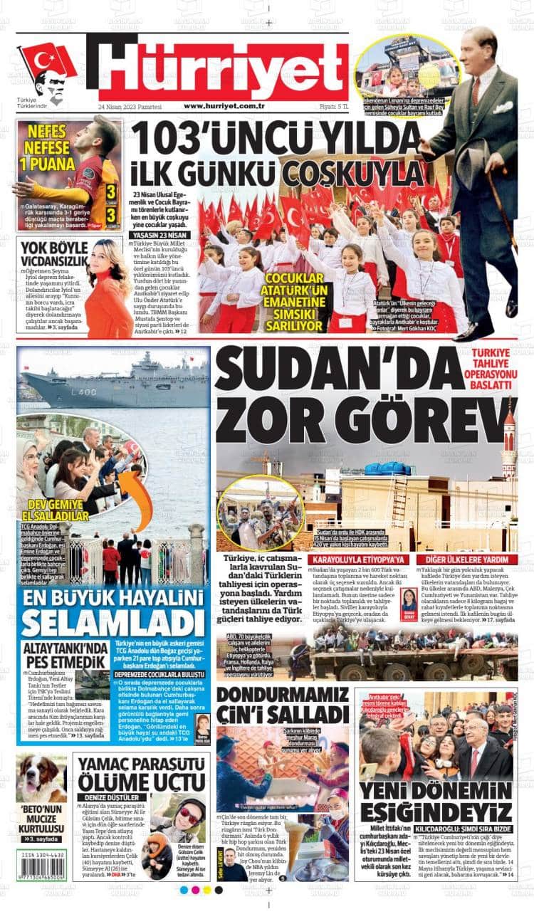 * Günün Ulusal Gazete Manşetleri – 25 04 2023Ulusal Gazetelerin 1. sayfaları Haber Merkezi Yayınlanma: 25.04.2023 - 11:50 Son güncellenme: 28.01.2025 - 07:16 Hürriyet