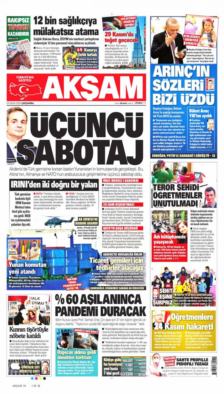 * Günün Ulusal Gazete Manşetleri – 25 11 2020Ulusal Gazetelerin 1. sayfaları Haber Merkezi Yayınlanma: 25.11.2020 - 11:50 Son güncellenme: 28.01.2025 - 19:23 Akşam