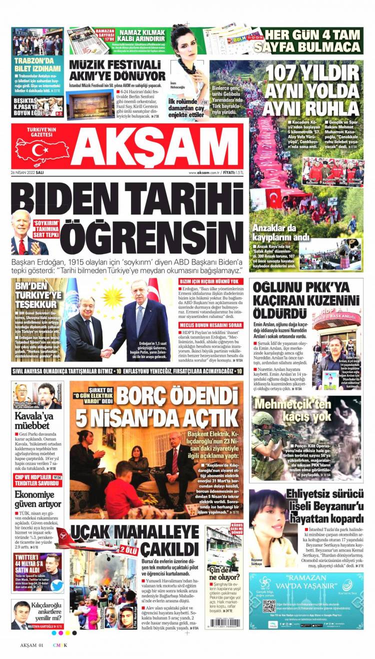 * Günün Ulusal Gazete Manşetleri – 26 04 2022Ulusal Gazetelerin 1. sayfaları Haber Merkezi Yayınlanma: 26.04.2022 - 11:50 Son güncellenme: 28.01.2025 - 12:06 Akşam