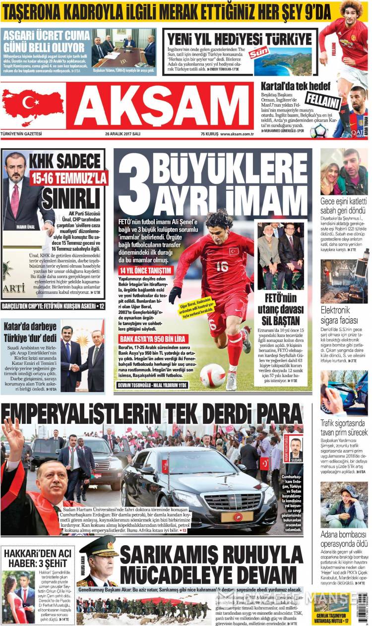 * Günün Ulusal Gazete Manşetleri – 26 12 2017Ulusal Gazetelerin 1. sayfaları Haber Merkezi Yayınlanma: 26.12.2017 - 11:50 Son güncellenme: 29.01.2025 - 13:51 Akşam