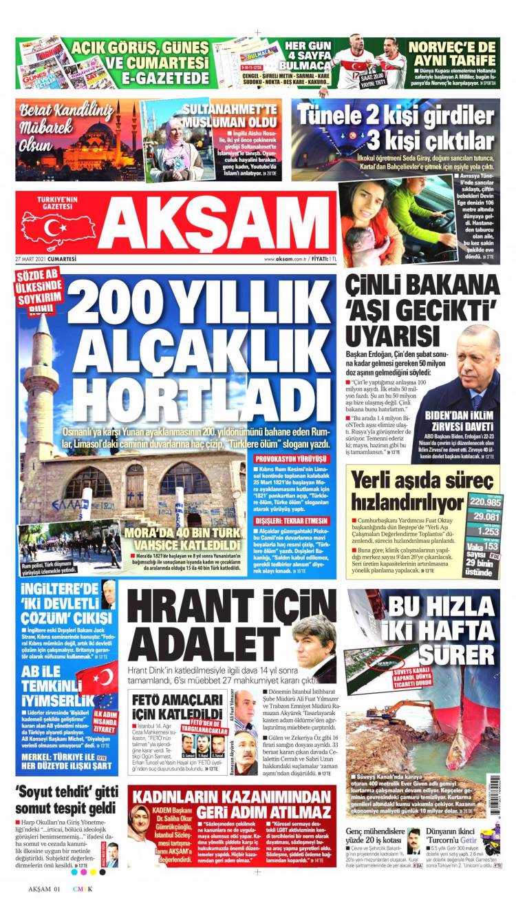 Günün Ulusal Gazete Manşetleri – 27 03 2021Ulusal Gazetelerin 1. sayfaları Haber Merkezi Yayınlanma: 27.03.2021 - 11:50 Son güncellenme: 28.01.2025 - 17:39 Akşam