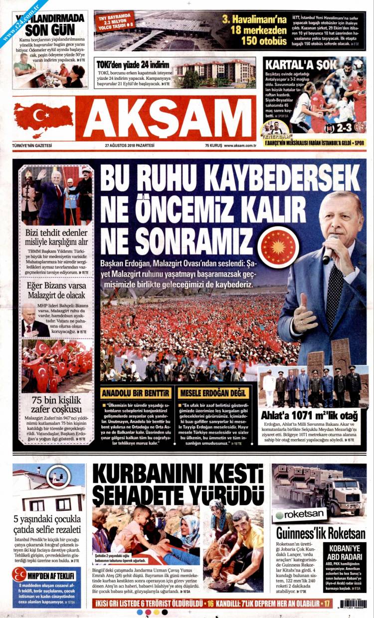 * Günün Ulusal Gazete Manşetleri – 27 08 2018Ulusal Gazetelerin 1. sayfaları Haber Merkezi Yayınlanma: 27.08.2018 - 11:50 Son güncellenme: 29.01.2025 - 07:38 Akşam