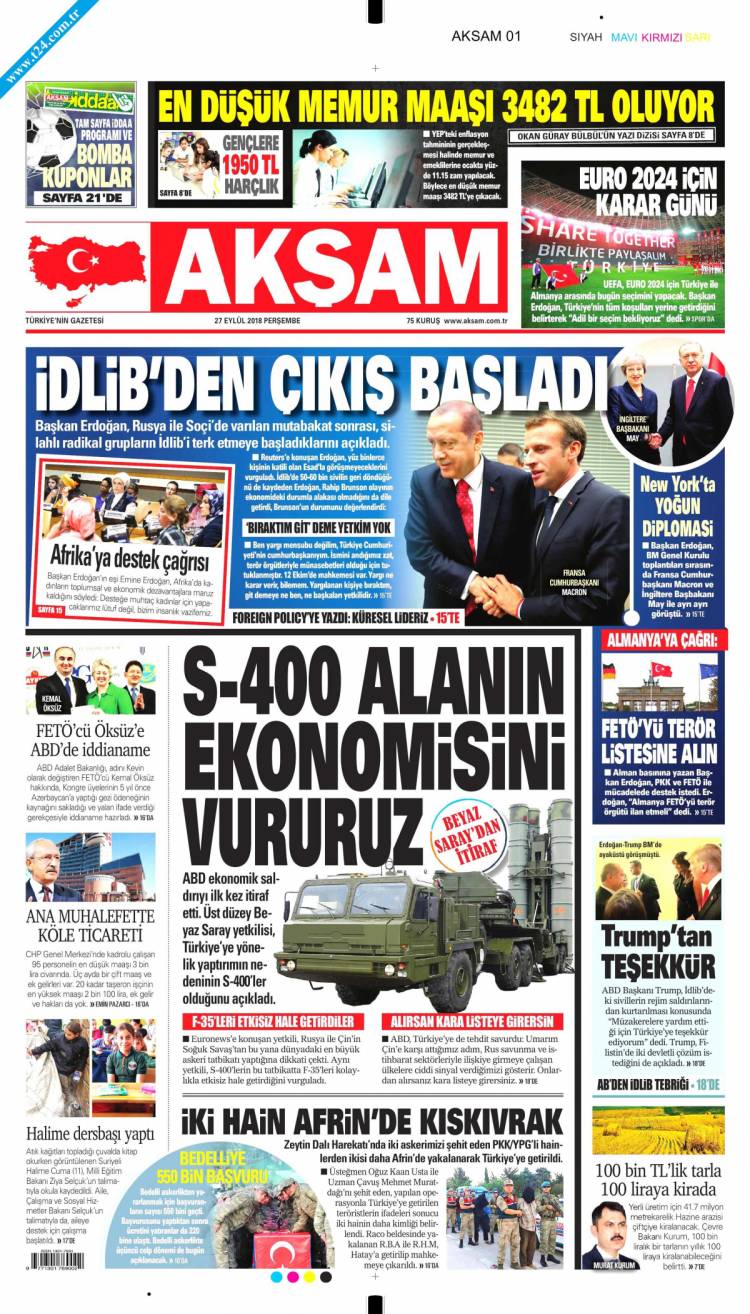 * Günün Ulusal Gazete Manşetleri – 27 09 2018Ulusal Gazetelerin 1. sayfaları Haber Merkezi Yayınlanma: 27.09.2018 - 11:50 Son güncellenme: 29.01.2025 - 07:01 Akşam