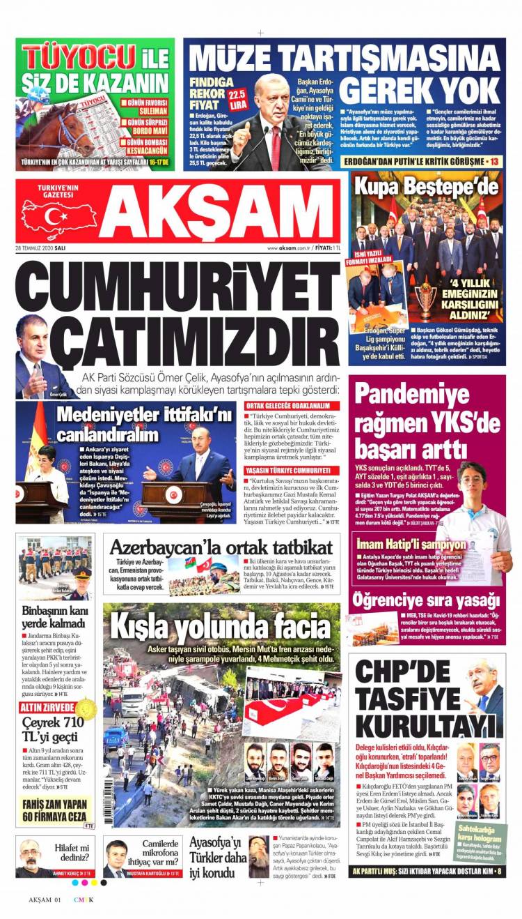 * Günün Ulusal Gazete Manşetleri – 28 07 2020Ulusal Gazetelerin 1. sayfaları Haber Merkezi Yayınlanma: 28.07.2020 - 11:50 Son güncellenme: 28.01.2025 - 21:09 Akşam