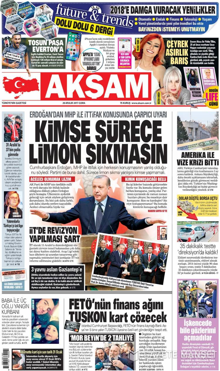 * Günün Ulusal Gazete Manşetleri – 29 12 2017Ulusal Gazetelerin 1. sayfaları Haber Merkezi Yayınlanma: 29.12.2017 - 11:50 Son güncellenme: 29.01.2025 - 13:45 Akşam