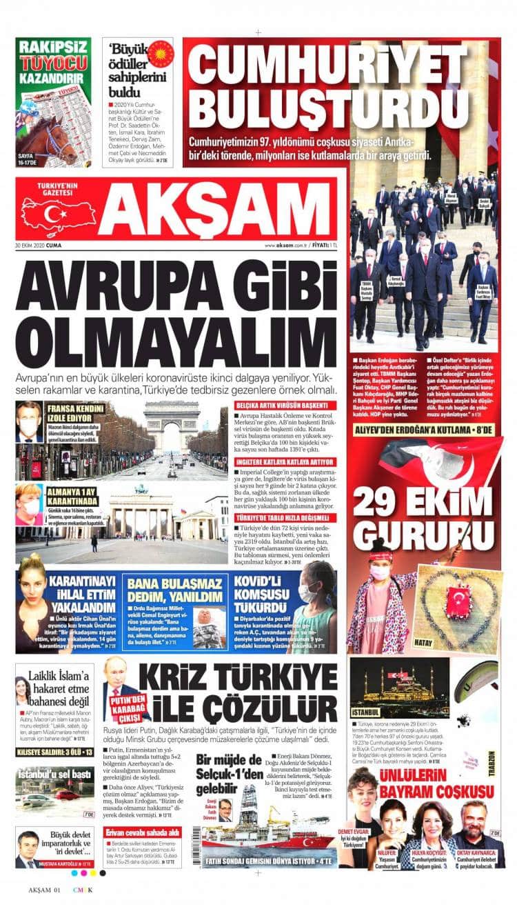 * Günün Ulusal Gazete Manşetleri – 30 10 2020Ulusal Gazetelerin 1. sayfaları Haber Merkezi Yayınlanma: 30.10.2020 - 11:50 Son güncellenme: 28.01.2025 - 19:45 Akşam