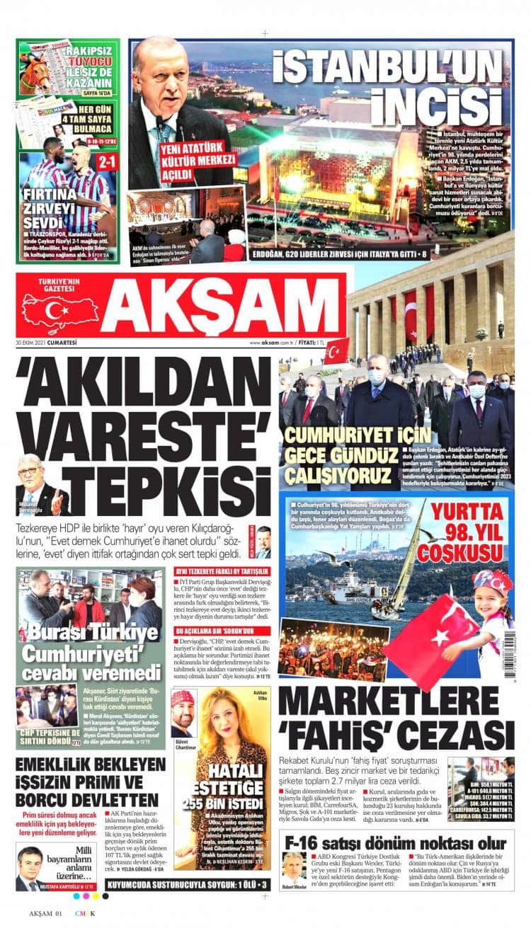Günün Ulusal Gazete Manşetleri – 30 10 2021Ulusal Gazetelerin 1. sayfaları Haber Merkezi Yayınlanma: 30.10.2021 - 11:50 Son güncellenme: 28.01.2025 - 14:37 Akşam