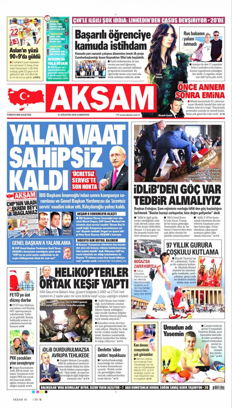 * Günün Ulusal Gazete Manşetleri – 31 08 2019Ulusal Gazetelerin 1. sayfaları Haber Merkezi Yayınlanma: 31.08.2019 - 11:50 Son güncellenme: 29.01.2025 - 01:33 Akşam