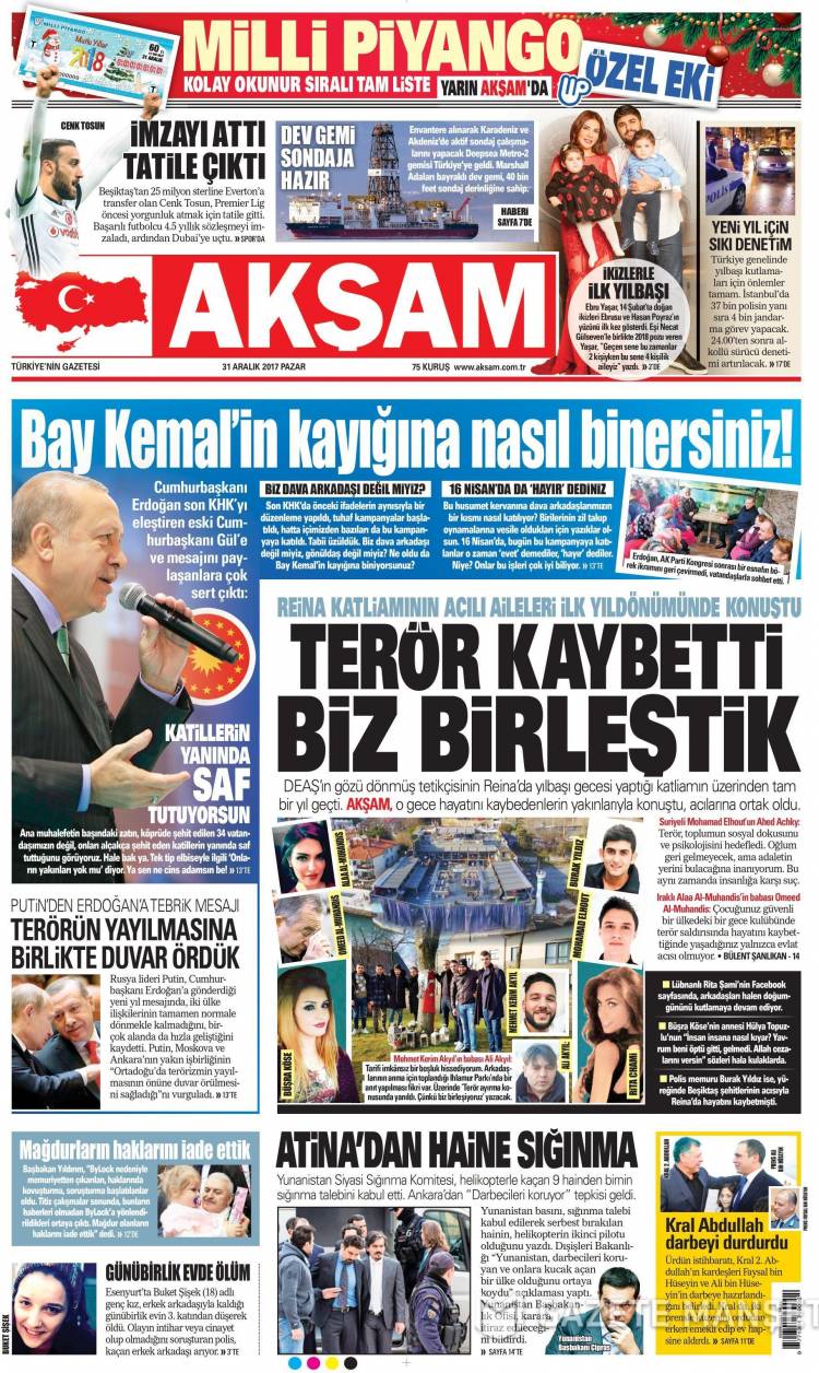 Günün Ulusal Gazete Manşetleri – 31 12 2017Ulusal Gazetelerin 1. sayfaları Haber Merkezi Yayınlanma: 31.12.2017 - 11:50 Son güncellenme: 29.01.2025 - 13:41 Akşam