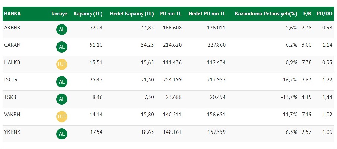 Şeker Yatırım, Akbank, Garanti, İş Bankası, TSKB ve Yapı Kredi Bankası için AL tavsiyesinde bulunurken, Vakıfbank ve Halkbank için TUT tavsiyesi verdi.